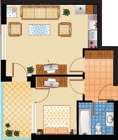 Квартира на 2-м этаже. Общая площадь 64,6 кв.м. Квартира состоит из коридора, гостиной с кухонным боксом, спальни, совмещенного сан.узла с установленной ванной и балкона.