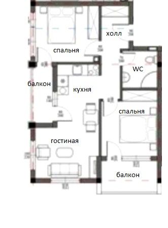 Квартира состоит из прихожей (со шкафом-купе), гостиной с кухонной зоной, 2-х спален, сан.узел с душем, 2-х балконов с видом на море.